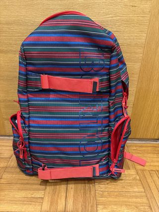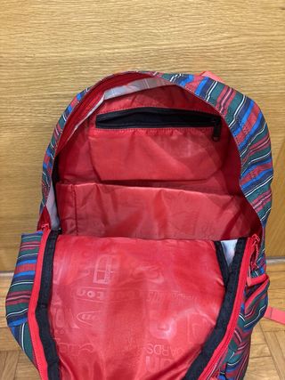 Mochila Burton con un diseño de rayas multicolor y detalles en rojo. Cuenta con un compartimento acolchado para proteger tu portátil. - Compartimento principal espacioso. - Bolsillos laterales con cremallera. - Correas ajustables para los hombros. - Asa superior para colgar. - Clip para llaves. - Bolsillo interior con cremallera.