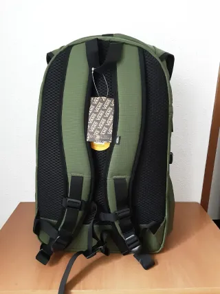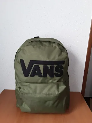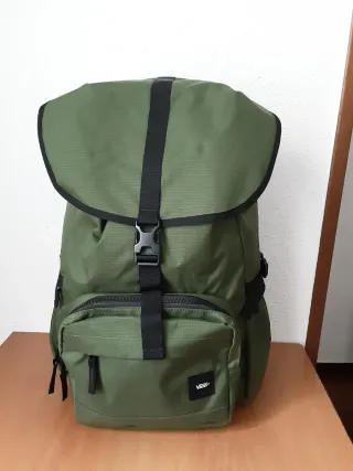 No negocio precio ni hago envios, entrego en mano en Laredo y Avilés. Mochila de la marca Vans en color verde oliva. Diseño moderno y funcional. - Compartimento principal espacioso 33 litros capacidad, con compartimento acolchado para portátil. - Bolsillo frontal con cremallera. - Correas ajustables para mayor comodidad. - Logo de Vans visible. - Cierre con solapa y correa con hebilla. =Dos bolsillos laterales para botella de agua. =Panel trasero con malla reticular.