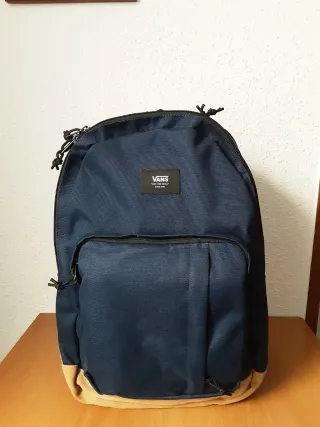 No negocio precio ni hago envios puedo entregar en mano en Laredo y Avilés. Mochila de la marca Vans con un diseño moderno y funcional. = Mochila de gran capacidad 30 litros jy resistencia. - Color principal azul marino. - Base en color beige. - Compartimento frontal con cremallera. - Cierre principal con cremallera. = Tiene un bolsillo lateral para botellande agua.