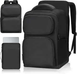 Mochila ESTARER de color negro, diseñada para portátiles de hasta 15.6 pulgadas. - Compartimento principal espacioso. - Bolsillos frontales con cremallera para organización. - Correas de hombro acolchadas y ajustables. - Asa superior reforzada para un agarre cómodo. - Incluye una funda para portátil.
