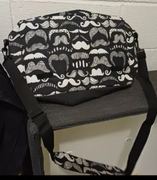 Bolso bandolera con un divertido estampado de bigotes en blanco y negro. Cuenta con un detalle de un gran bigote amarillo. - Ideal para llevar libros, portátil o como bolso de diario. - Correa ajustable para mayor comodidad.