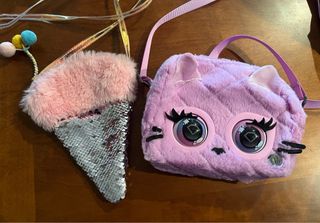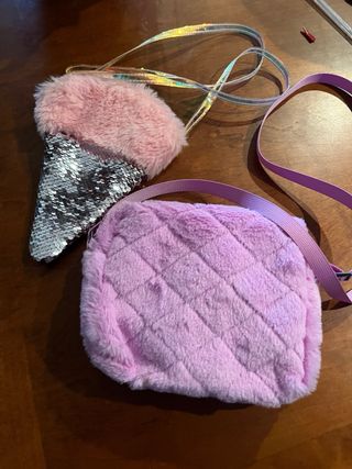 2 Bolsos infantiles con un diseño divertido y llamativo. -1. Parte frontal y reverso con lentejuelas. -2.Detalle de peluche suave en la parte delantera con ojos que se mueven