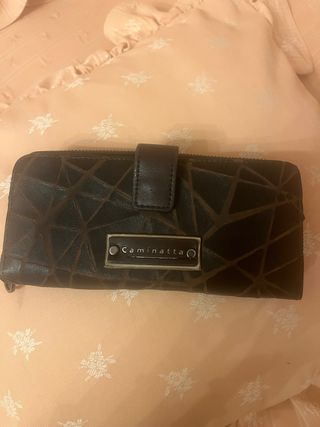 Monedero billetero de la marca Caminatta con un diseño geométrico. - Diseño con líneas irregulares. - Cierre de botón a presión y cremallera.