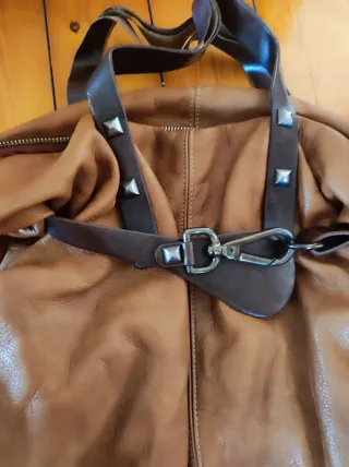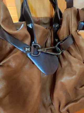 Bolso de piel con un diseño moderno y detalles únicos. - Material: Piel - Color: Marrón - Adorno: Tachuelas metálicas - Cierre: Hebilla y mosquetón Tiene las asas un poco despegadas ,pero se puede solucionar perfectamente