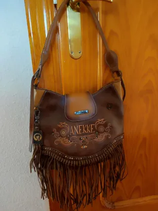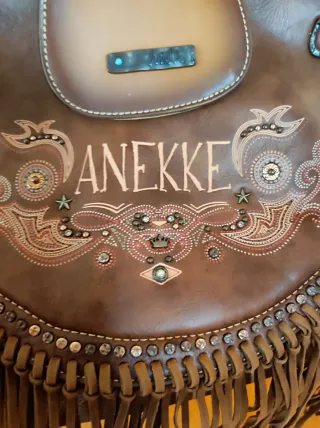 Bolso de la marca Anekke, modelo Arizona. Un accesorio con un diseño único y llamativo. - Adornos de pedrería y tachuelas. - Detalles de flecos en la parte inferior. - Grabado del nombre de la marca.