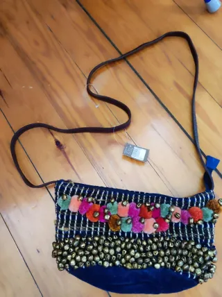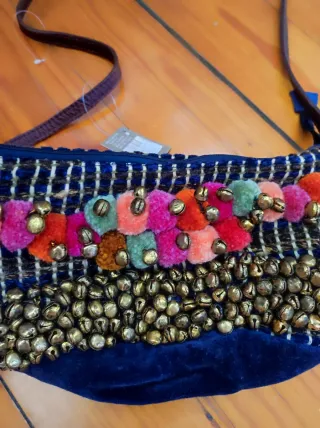 Bolso de tela con un diseño llamativo y adornos. - Decorado con pompones de colores. - Adornado con cascabeles metálicos. - Correa para llevar al hombro.