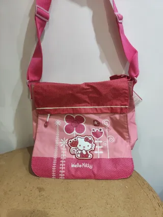 Bolso con diseño de Hello Kitty en tonos rosas y rojos. - Correa ajustable. - Cierre de cremallera. - Estampado de flores y Hello Kitty.
