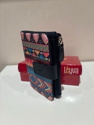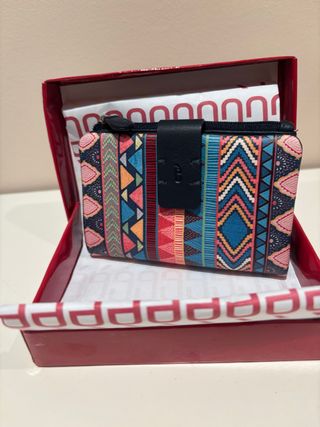 Mini-cartera con un diseño vibrante y llamativo, perfecta para organizar tus pertenencias, y con un tamaño pequeño que entra en cualquier bolso 11,5x7,5. - Monedero con cierre de cremallera. - Estampado geométrico y tribal. - Tiene 6 ranuras para tarjetas, y grande para billetes, así como monedero exterior con cremallera. - Sin estrenar, es su embalaje original.
