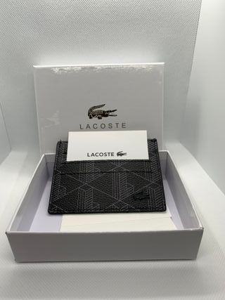 Elegante tarjetero con un diseño geométrico en negro. Perfecto para llevar tus tarjetas esenciales con estilo. - Diseño geométrico. - Color negro. - Logo de Lacoste.