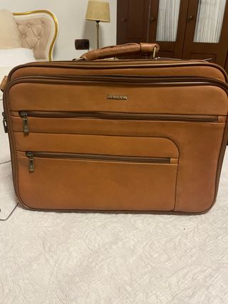Maletín de cuero marrón de la marca Da Milano. Diseño elegante y funcional. - Compartimentos interiores. - Cierre de cremallera. - Correa ajustable. - asa de mano - Apertura para sujetarla en la asa extensible de una maleta de viaje