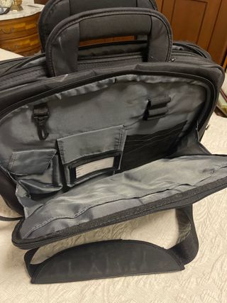 Maletín Targus de color negro. - Compartimento principal con cierre de solapa. - Correa ajustable para el hombro. - Asa superior para llevar en la mano. - Bolsillo frontal con cierre de clip. - Asas para llevarlo de mochila o sujetarlo a yna maleta de viaje con asa extensible. - compartimiento alcochado para llevar el ordenador