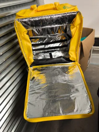 Mochila de reparto Glovo en color amarillo. - Asa superior para un agarre cómodo. - Cierre de cremallera. - Logo de Glovo en la parte frontal. Muy poco uso, prácticamente nueva