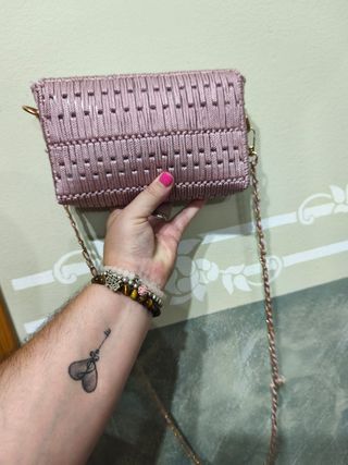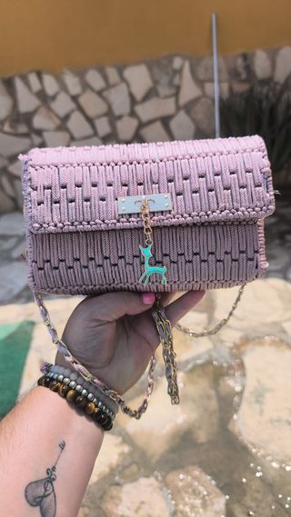Precioso bolso hecho a mano con un diseño tejido. Es de color rosa y tiene una cadena dorada para colgarlo. Incluye un pequeño dije con forma de ciervo. Es ideal para llevar tus cosas esenciales con estilo. Tengo mas modelos