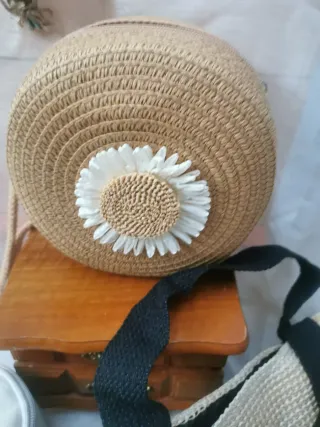 Conjunto de tres bolsos de diferentes estilos.Precio individual - Bolso redondo de paja con detalle de flor. - Bolso blanco acolchado con cadena. - Bolso de tela de paja con asas negras.