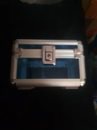 Maletín o joyero con un diseño moderno y práctico. Ideal para guardar tus accesorios. - Acabado plateado en los bordes y estructura. - Tapa superior de color azul translúcido. - Asa metálica para facilitar su transporte. - Cierre de seguridad.