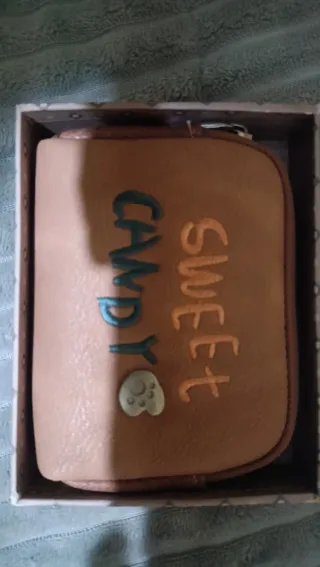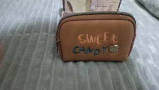Monedero de color marrón con un diseño bordado. - Bordado con las palabras SWEET CANDY. - Cierre de cremallera. - Pequeño detalle metálico decorativo.