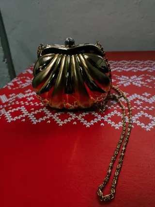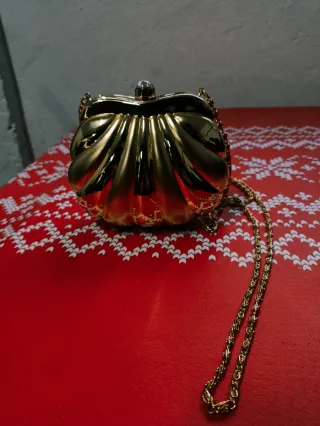 Elegante bolso de mano con un diseño acanalado y un acabado brillante. - Color dorado metálico. - Asa de cadena dorada. - Cierre de broche con detalle de cristal.