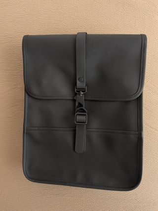 Mochila Rains en color negro, tamaño pequeño. Se encuentra en perfecto estado. - Diseño moderno y funcional. - Cierre con correa y botón a presión.