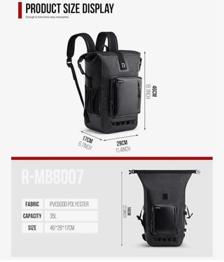 Mochila de gran capacidad, ideal para el día a día o escapadas. Impermeable. - Fabricada en PVC500D POLIÉSTER. - Capacidad de 35 litros. - Dimensiones: 46x29x17cm.
