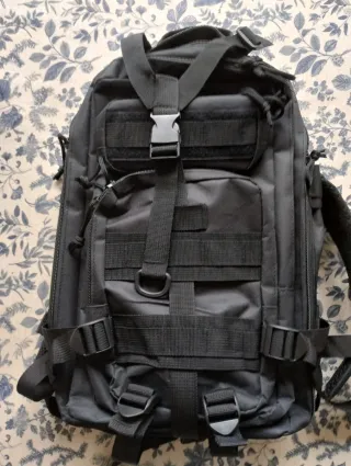 Mochila de estilo militar con múltiples compartimentos y correas. - Diseño robusto y funcional. - Cierres de hebilla y cremallera. - Correas ajustables para mayor comodidad. - Compartimentos exteriores con sistema MOLLE. -Ligera y cómoda. -Usada dos veces, literal.