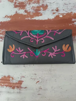 Monedero con un bonito diseño bordado. - Cierre de solapa. - Detalles florales en rosa y verde. - Acabado en piel sintética.