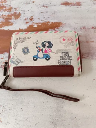 Monedero con un diseño encantador y detalles de viaje. - Estampado de chica en scooter y maletas. - Acabado en piel sintética. - Cierre de cremallera.