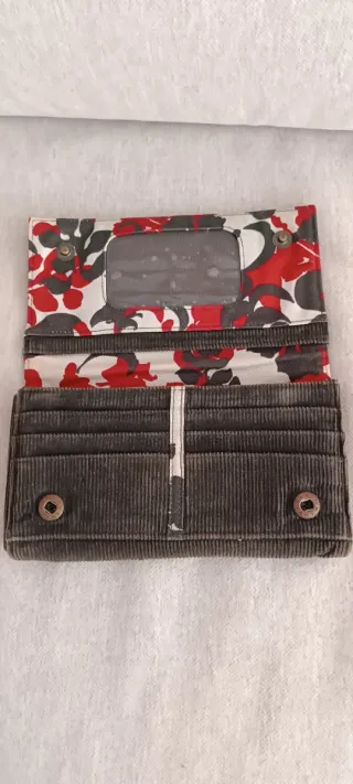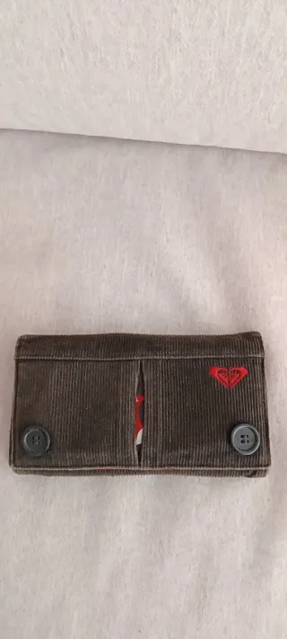 Cartera de pana de la marca Roxy. - Color marrón con detalles en rojo. - Cierre con botones. - Logo de Roxy bordado en rojo.