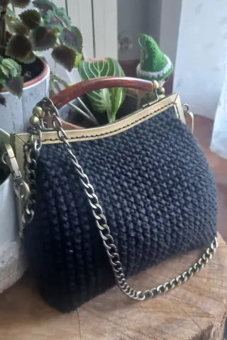 Bolso artesanal de crochet con un diseño elegante y moderno. Perfecto para complementar tu estilo. - Cierre de boquilla metálico. - Asa de mano rígida. - Cadena metálica para llevar al hombro.