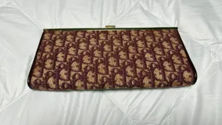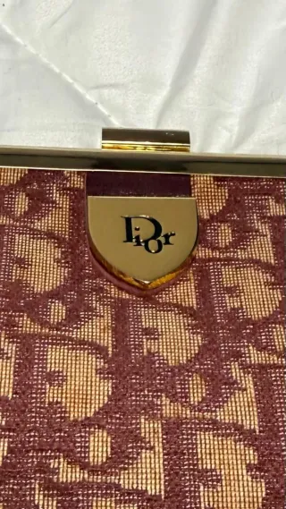 Elegante bolso Christian Dior con el icónico monograma. - Diseño en tela con patrón de monograma. - Tonos marrones y beige. - Ribete en piel. - Cierre de clip metálico.