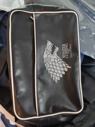Mochila negra con diseño de Juego de Tronos. - Detalle del lobo Stark. - Borde blanco. - Cremallera frontal.