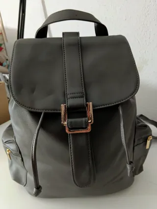 Mochila gris con hebilla dorada
