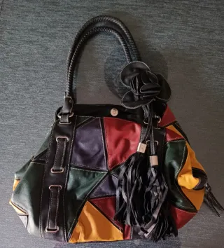 Bolso de piel con un diseño patchwork único y llamativo. - Combinación de parches en varios colores. - Asas trenzadas. - Adorno de flor y flecos. - Cierre de botón a presión.