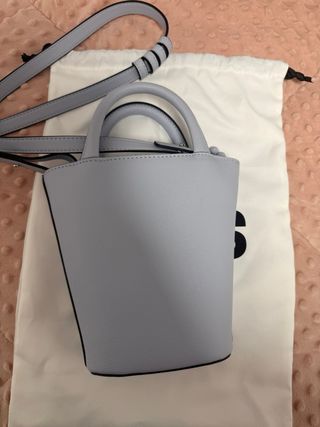 Bolso Tous de tamaño pequeño, con un diseño moderno y detalles únicos. - Color azul grisáceo - Adornado con tachuelas plateadas. - Incluye un charm de oso. - Asa corta y correa para colgar.