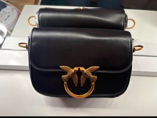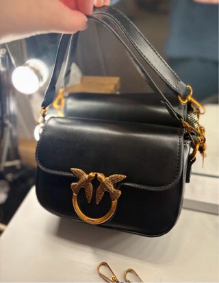 Elegante bolso de la marca Pinko. - Color negro con detalles dorados. - Diseño con el icónico motivo de pájaros. - asa larga y corta para llevarlo al hombro