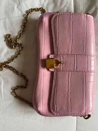 Bolso pequeño con textura de cocodrilo en color rosa. - Cierre de solapa con detalle de candado. - Cadena metálica dorada para llevar al hombro o cruzado. - Diseño elegante y moderno.