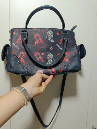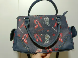 Bolso de la marca ROSALITA con un diseño llamativo. - Estampado con lazos y tacones. - Detalles en color azul marino. - Adornos de tachuelas en las esquinas. - 8 Apartados