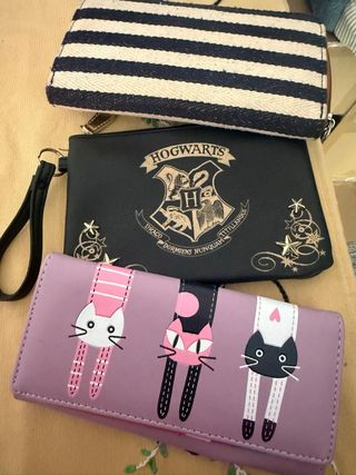 Conjunto de tres monederos de mano con diseños variados. - Un monedero con rayas azules y blancas. - Un monedero negro con el escudo de Hogwarts. - Un monedero lila con tres gatos. - Cierre de cremallera. Se venden en pack o por separado. 4€ cada uno por separado, 10€ el pack. Al monedero azul de rayas le falta un accesorio en la arandela de apertura de la cremallera, el resto están en perfecto estado.