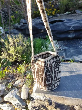 Bolso artesanal Wayuu comprando en Guatapé, Colombia. - Tejido a mano. - Tira de hombro. - Diseño geométrico en tonos tierra.