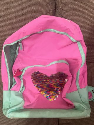Mochila rosa y verde con corazón lentejuelas