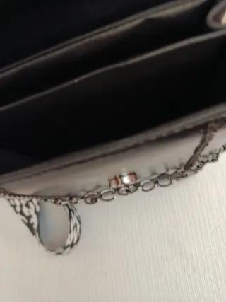 Bolso de piel sin estrenar, con un diseño moderno y elegante. - Cierre de solapa con detalle de corazón. - Cadena metálica decorativa. - Correa ajustable con estampado. - Base con protectores metálicos.