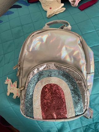 Mochila infantil con un diseño divertido de unicornio y arcoíris. - Cierre de cremallera. - Adorno de unicornio colgante. - Detalle de lentejuelas en el arcoíris.