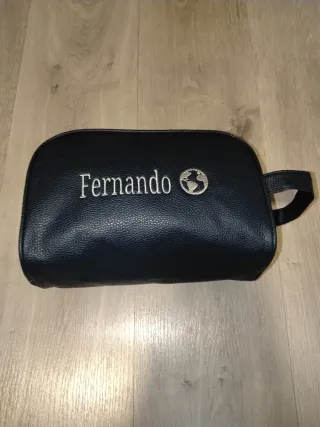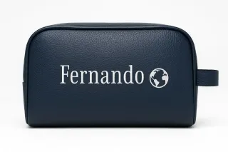 Neceser de hombre con un diseño elegante y práctico. - Material: Polipiel texturizada. - Color: Azul marino. - Bordado frontal con nombre Fernando y un globo terráqueo. - Asa lateral para facilitar su transporte.