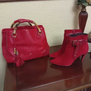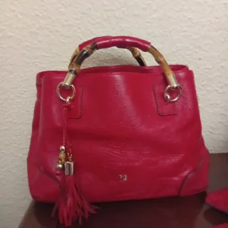 Elegante bolso de piel en color rojo, con un diseño único de Purificación García, con borla de piel . asas con piel y bambú, base y esquinas en perfecto estado, interior forrado en perfecto estado con tres departamentos separados, el central con cremallera grabada con la marca y bolsillo lateral con cremallera grabada con la marca y chapa logotipo PURIFICACIÓN GARCÍA. mide 32cm de ancho .23 cm alto .19cm de fondo - Asas de bambú con detalles dorados. - Colgante con borla y abalorios. - Logo metálico de la marca en la parte frontal.