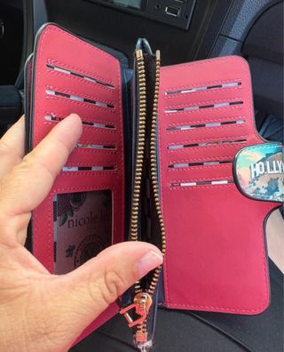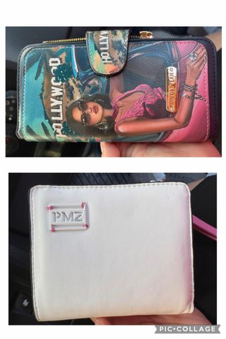 Conjunto de dos carteras de la marca Nicole Lee. - Una cartera presenta un diseño vibrante y colorido. - La otra cartera es de color blanco.