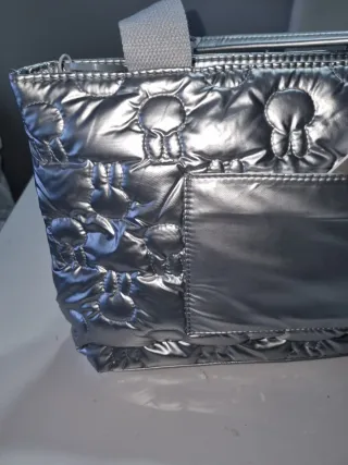 Bolso de mano plateado con un diseño acolchado y un bolsillo frontal. - Estampado de Miffy. - Cierre de cremallera. - Asas cómodas.