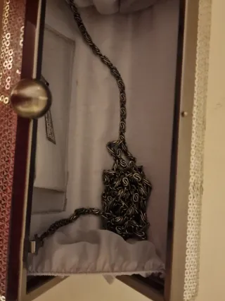 Elegante bolso de mano con un diseño de brillos, perfecto para ocasiones especiales. - Acabado brillante. - Cadena metálica para llevar al hombro o cruzado