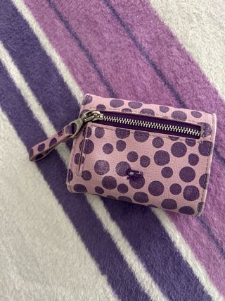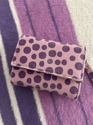 Monedero con un divertido estampado de lunares. - Diseño con lunares morados sobre fondo rosa. - Cierre de solapa.