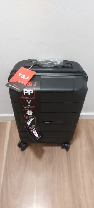Maleta de mano de la marca T&J en color negro. Es un tamaño pequeño, ideal para viajes cortos. - Diseño moderno y resistente. - Ruedas para facilitar el transporte.