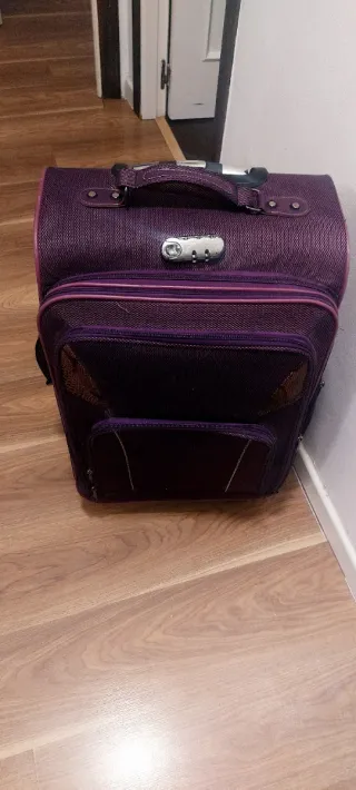 Maleta mediana de tela con un diseño texturizado. - Asa retráctil. - Ruedas para facilitar el transporte. - Candado de combinación integrado. - Bolsillo frontal con cremallera.