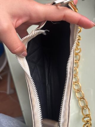 Bolso bandolera de color beige con un diseño texturizado. - Correa ajustable. - Cierre de cremallera. - No esta usado, pero tiene unas manchas que no vi cuando lo compre.